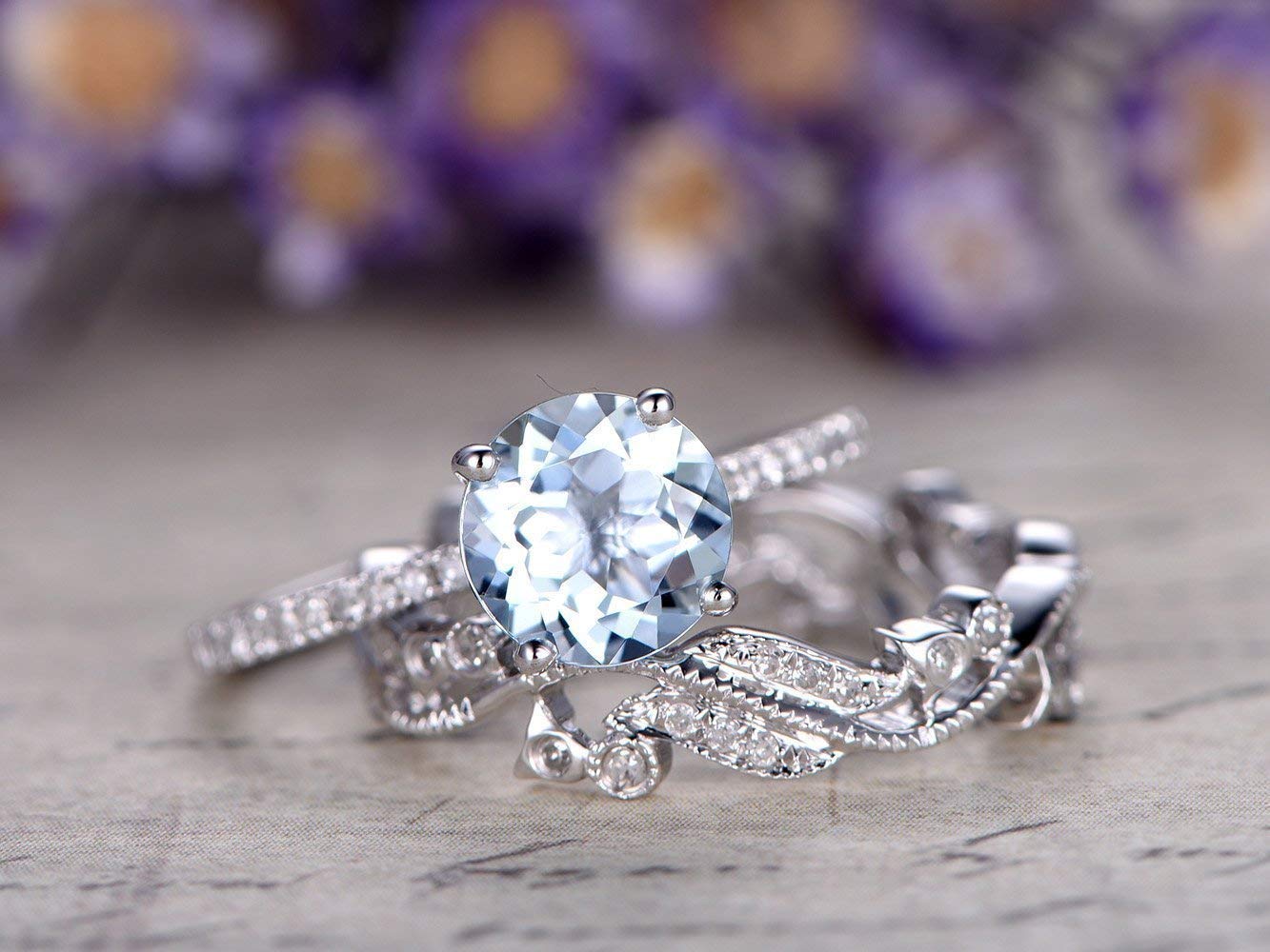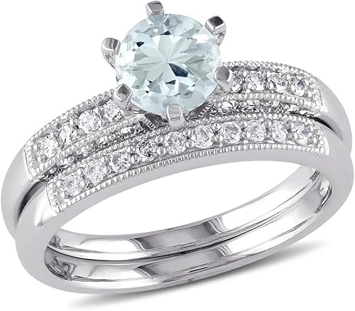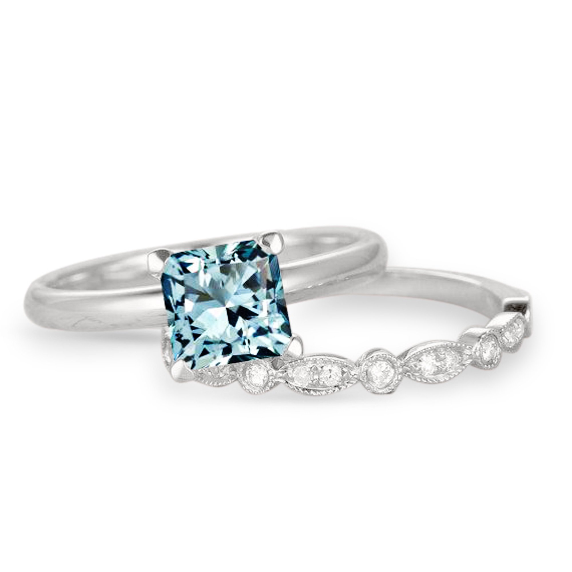 Julia roberts top gem aquamarine & diamond ring set in solid 14k white gold with vs diamonds. 2 mm eternity round aquamarine wedding band stackable ring in 9k fine gold. Find the best flower wedding rings set for your loved one gem details:center gem: Card for wedding invitation, background.