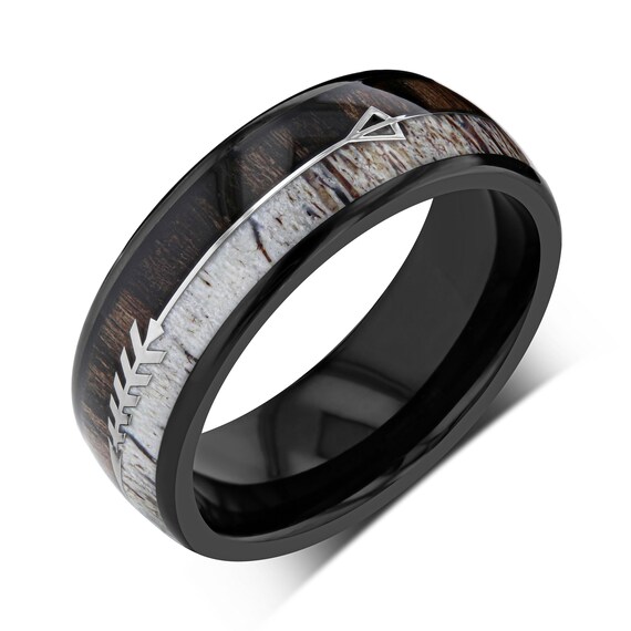 These deer antler rings have been designed for the outdoorsman. Titanium & deer antler ring width: This titanium wedding ring features a flat profile with a pattern of repeating deer antlers that are laser engraved all around it. These deer antler rings have been designed for the outdoorsman.